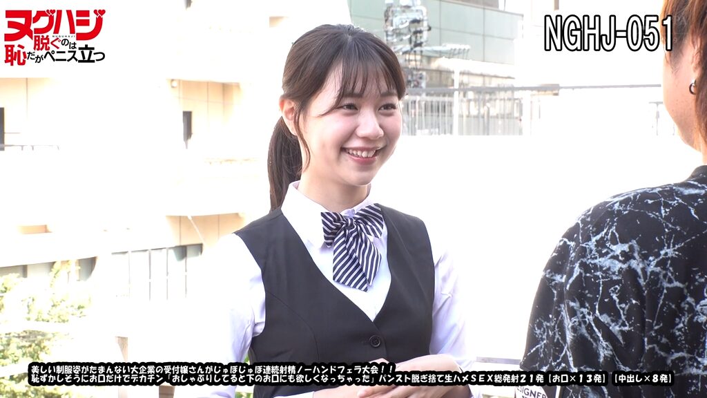 「美しい制服姿がたまんない大企業の受付嬢さんがじゅぼじゅぼ連続射精ノーハンドフェラ大会!!恥ずかしそうにお口だけでデカチン「おしゃぶりしてると下のお口にも欲しくなっちゃった」パンスト脱ぎ捨て生ハメSEX総発射21発【お口×13発】【中出し×8発】」はぶっかけAV作品(品番: nghj00051)です。出演女優は五芭さんで、口内・胸射のシーンを収録しています。